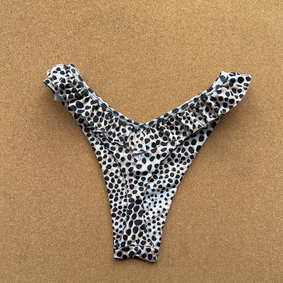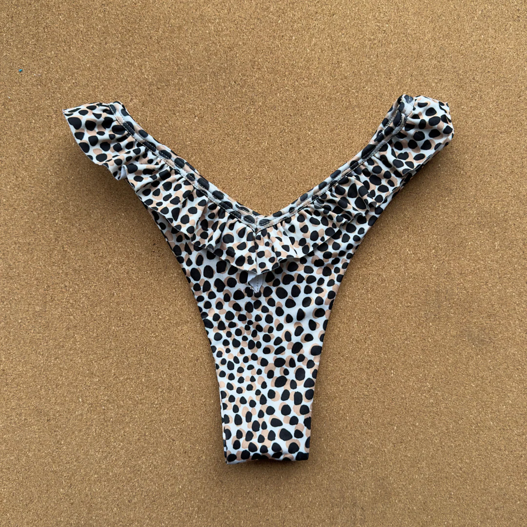 modelo a la cadera alta , muy femenino corte colaless , el detalle de vuelos