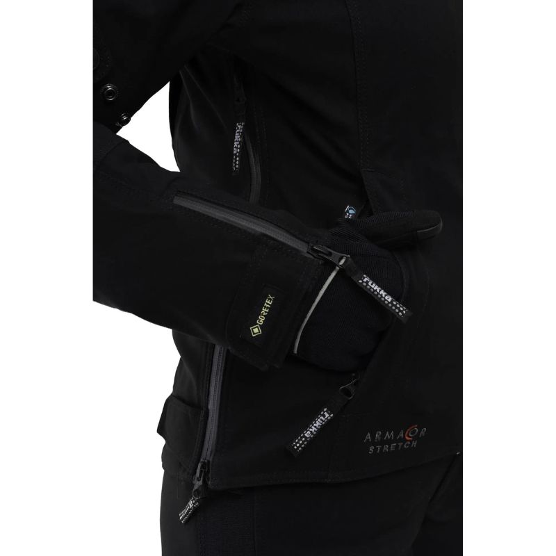 Chaqueta de moto Rukka Armaprotection para mujer. Neopreno suave en cuello. Extremos de las mangas con puños interiores impermeables de GORE-TEX®. Collar protector integrado ATS (=collar contra tormentas adjunto) Gore-Tex® Stretch, que se puede ocultar en su bolsillo. Una chaqueta de plumón extra cálida separada con relleno de 90 g (9010 plumónplumas), fácil de guardar en su propia bolsa pequeña. Extremos de mangas ajustables con cremalleras y cierre de velcro. Bajo ajustable con cierre de velcro. Una correa en la entrepierna y una cremallera larga de conexión para los pantalones. Gore-Tex® Pro de 3 capas 100 % transpirable, resistente al viento y al agua, laminado con tejido exterior de poliamida elástico resistente a la abrasión y al desgarro. Fortalecimiento Armacor® en codos y hombros. Dos bolsillos inferiores resistentes al agua con cremalleras. Dos bolsillos en chaqueta interior desmontable.